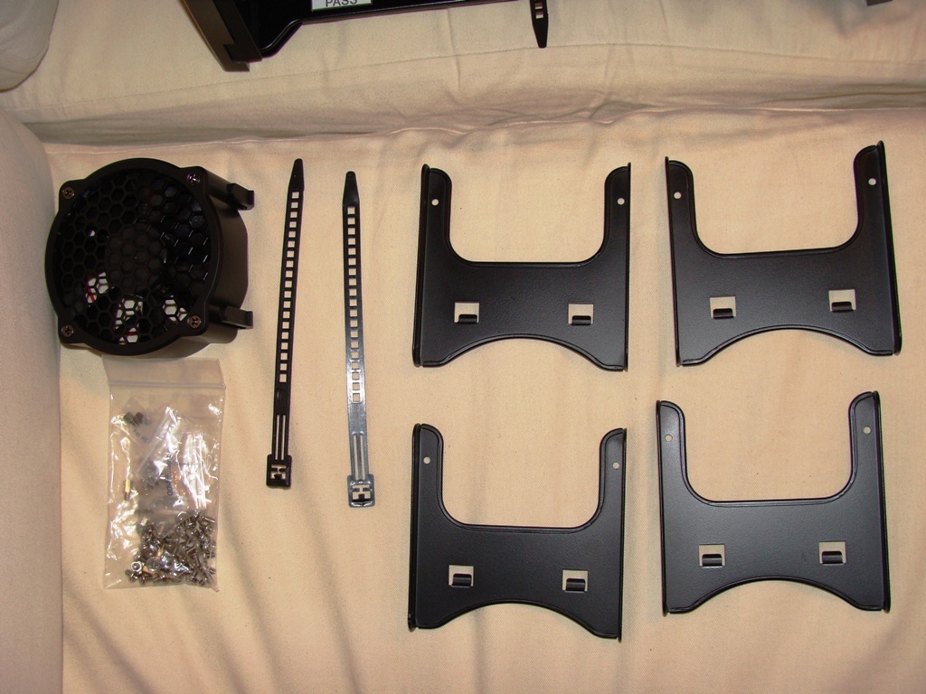 付属品一式。ファンは3.5インチベイを冷却するために使います。右側のは背中にHDDしょわせるためのもの。