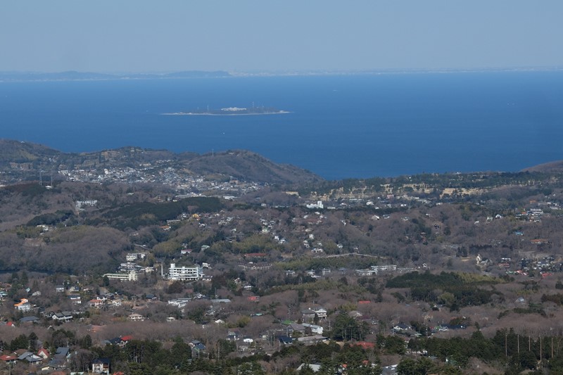 初島と川奈あたりかな。遠く三浦半島や房総半島まで見える。