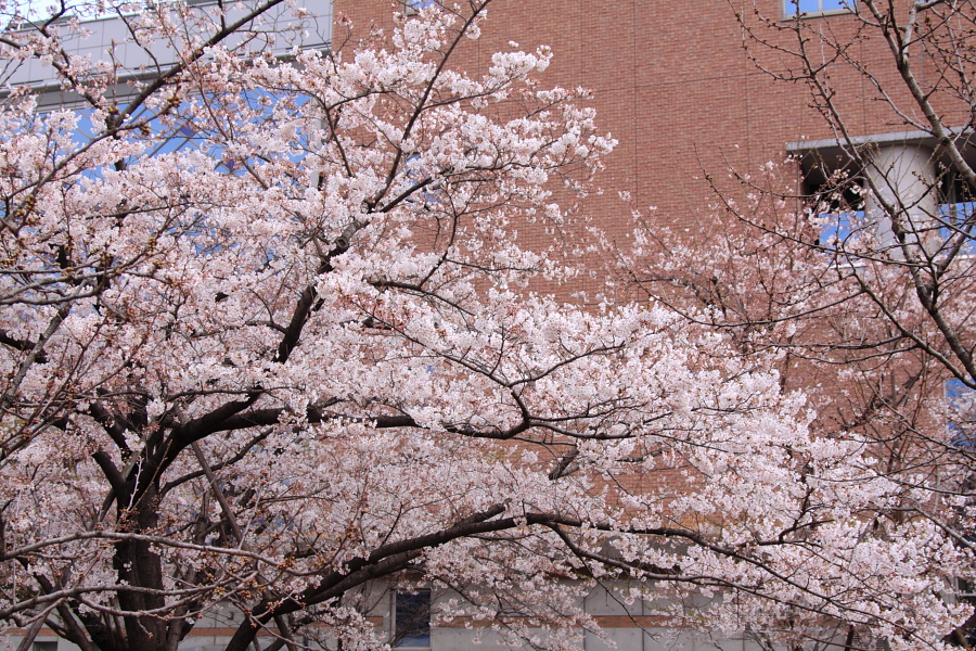 いや、まだ五分咲きなので散ってはいませんけど。花冷えしているせいかなかなか満開までいきませんね。週末までこの状態かな。入学式までちゃんと咲いていそうで何よりです。今日入社式の人は桜の下で記念撮影できたかな?午前中天気悪かったので、撮れなかったかもしれませんね。