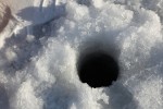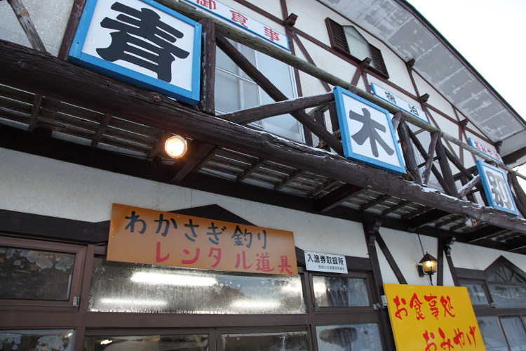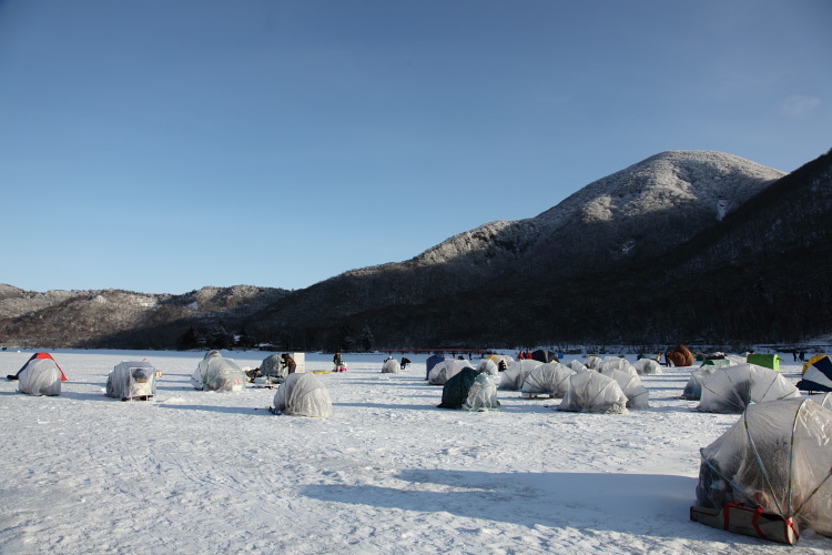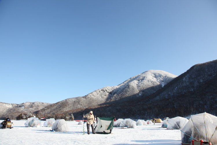 さて、朝7時前になんとか赤城大沼に到着し、青木旅館別館でわかさぎ釣りの道具一式を借りてさっそくわかさぎを獲るぞ!と意気揚々と湖面に歩き出す…。しかし、ほんとーに寒いな、おい!湖面を渡るからっ風がカラダを容赦なくなぶります。てか、太陽出ているのですが氷点下5℃とか。骨まで凍るぜ、東京湾で文句言っていてすいません、てな気分です。