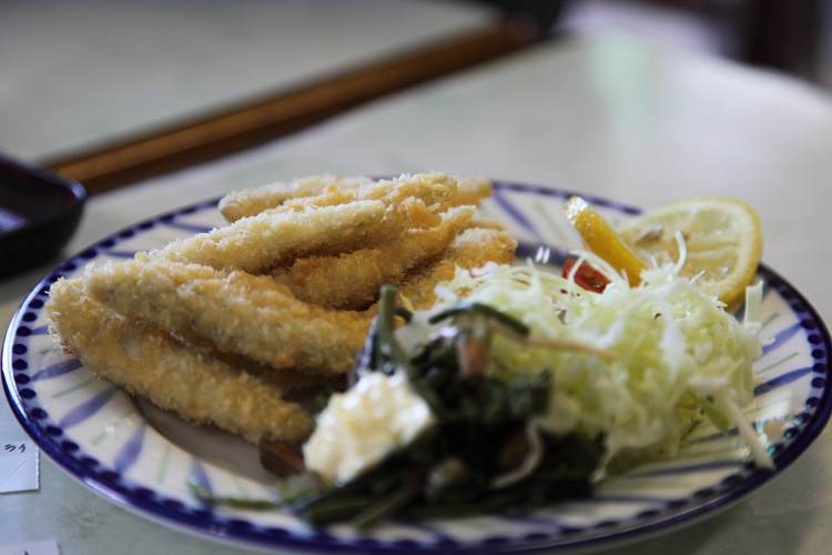 自分もそうなのですが、知人も釣れないとあっという間に飽きるタイプ。7時半から釣りをして、9時には撤収して宿の食堂でメシ食ってましたw