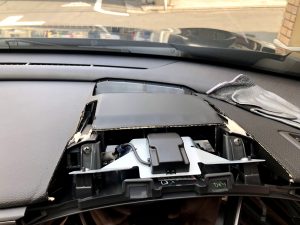 カーボン風のカバーを取り去ります。取らなくても作業はできるけど、傷付きそうなのと左側はアンテナケーブルを通すときなどに開いていればオペレーションしやすい、最後にナビを組み付けるときにケーブルのハンドリングしやすい、というメリットがあるので、外しちゃっておこう。
