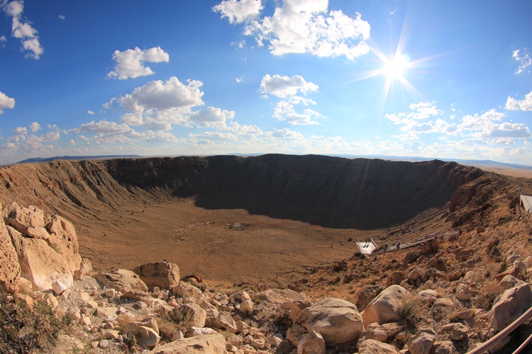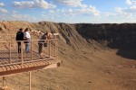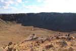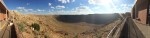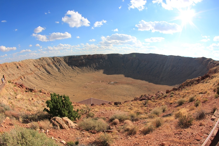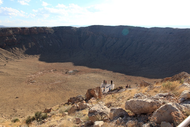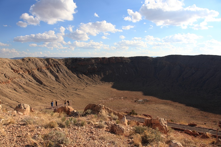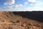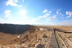 入場料がちと高いな($18)と思いつつも40年の想いなのだから、多少ガマンしてw入ってみる。そこへ入ったときに思ったことはこんなにでっかい穴ぼこを一瞬で作っちゃうのかよ、隕石恐い!だった。もっとも恐竜を滅ぼしたユカタン半島の隕石に比べればチリに等しい大きさなんだろうが、この隕石でも160キロ以内にいた生物を即死させたというのだから、恐ろしいことこの上ない。この隕石孔から少し離れた場所から見返すと、隕石孔のフチが隆起しているのがわかる。アリゾナの大地には悠久の時を経て造形されたグランドキャニオンもあれば、一瞬にして造形された隕石孔のようなものもあり、極端な二つが同居していて興味深い大地になってるなと思った。