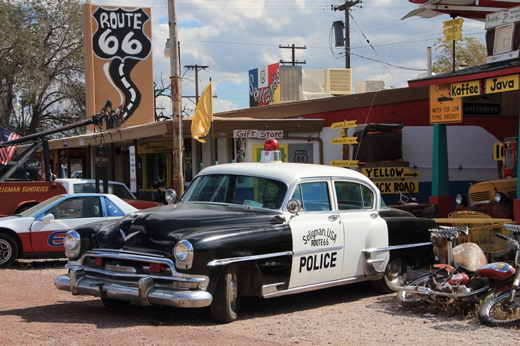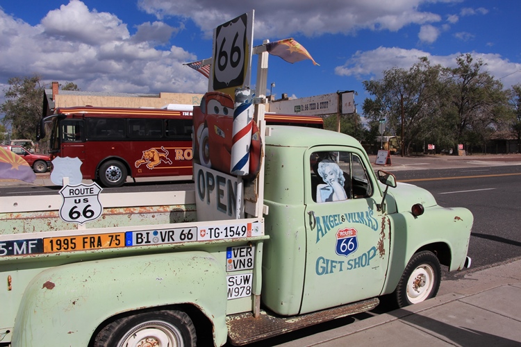 アメリカのインターステイトハイウェイを走っているとそのうち景色にも見慣れてきて飽きてしまう。特にこのキングマンからグランドキャニオンへの起点となるウィリアムズまでのI-40は何度か走ったこともあり、退屈に感じる。そんなころやっとこセリグマンに到着。セリグマンはいわゆるアメリカのかつての大動脈であったルート66に残された古い町並みを見られるところで、いわゆるディズニー映画のカーズのモチーフになっている町だ。